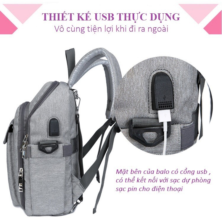 Mặt bên của balo có cổng usb có thể kết nối sạc dự phòng sạc pin cho điện thoại.