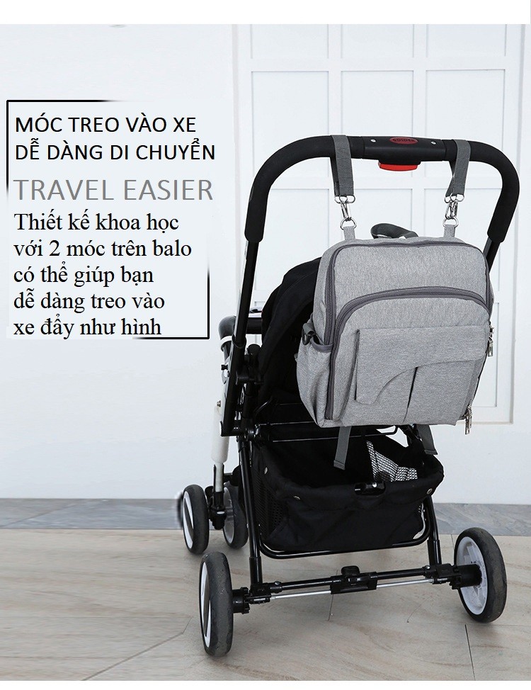 Thiết kế thông minh với 2 móc treo trên balo giúp dễ dàng treo vào xe đẩy