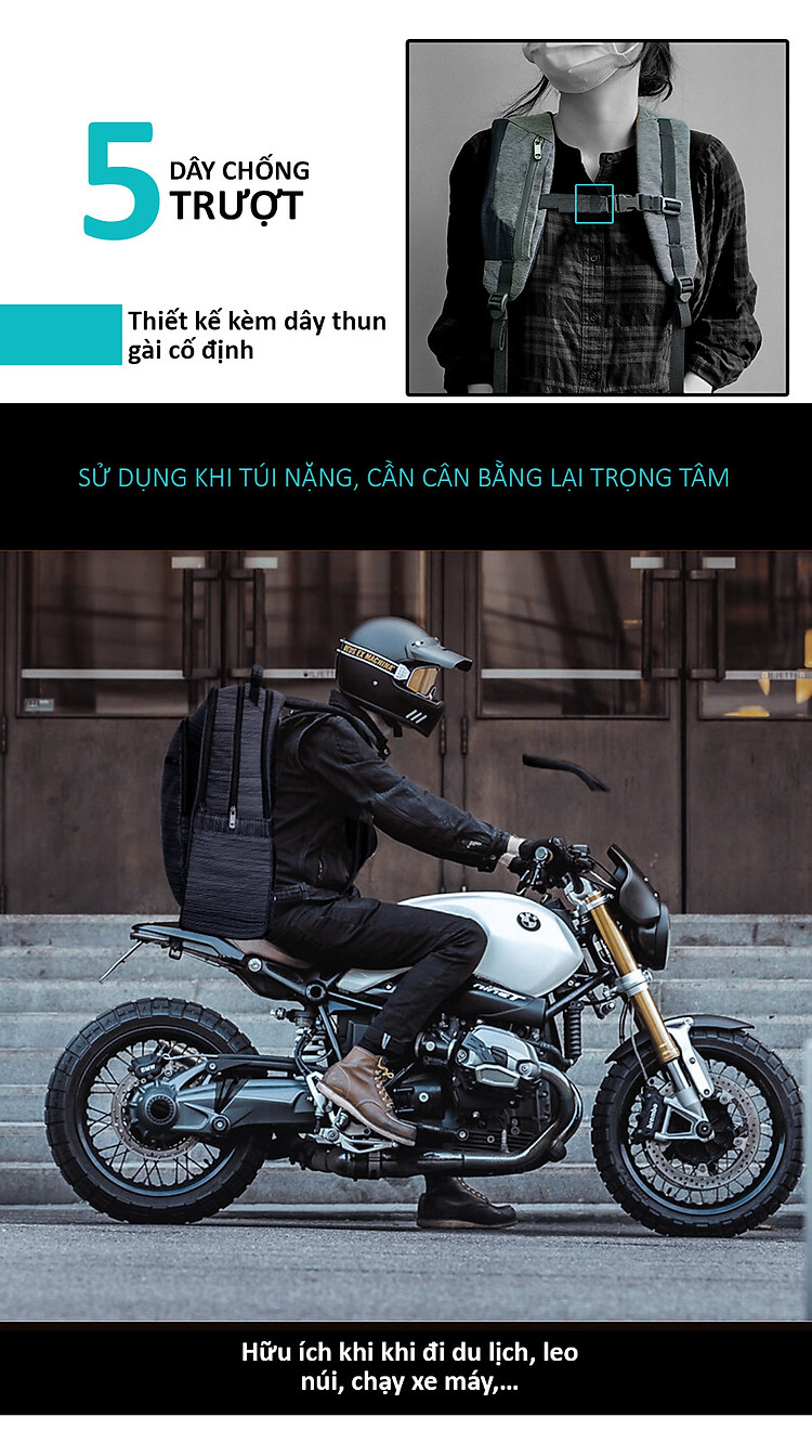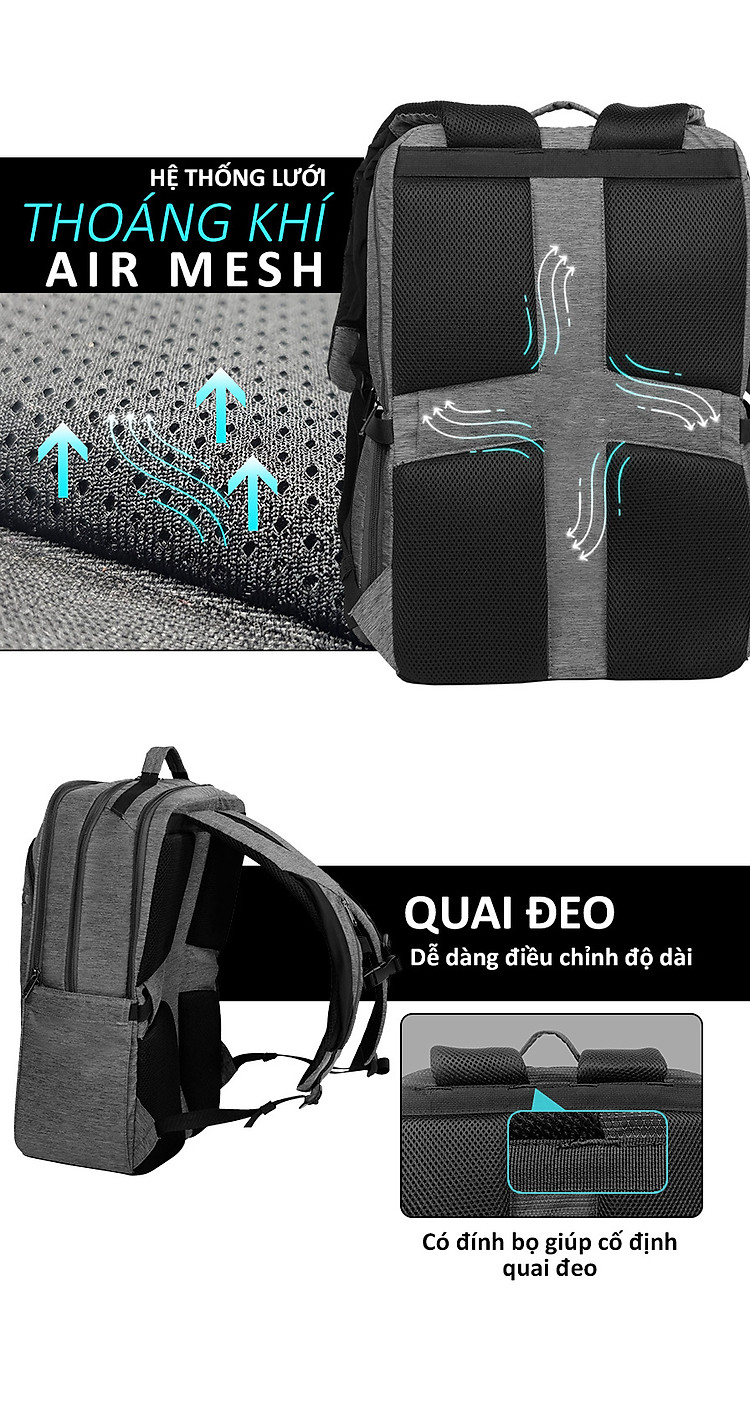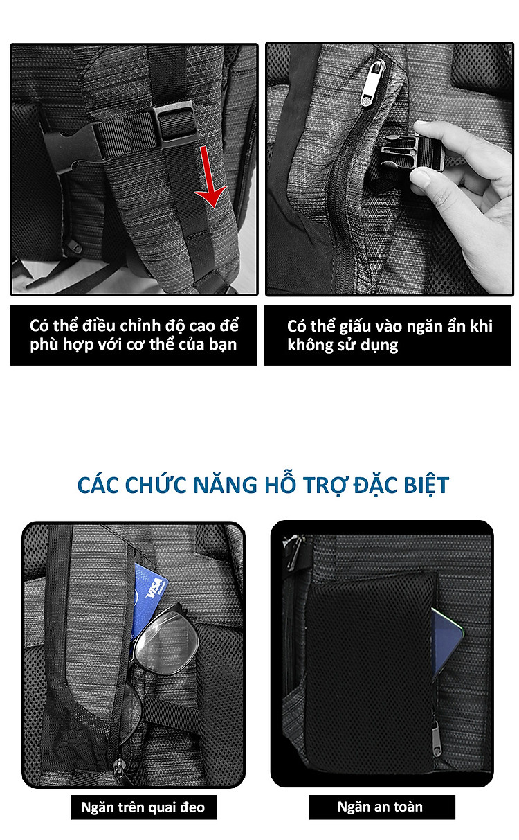 - Quai đeo: thiết kế ôm rất sát hai vai, chắc chắn, việc nới dài – thu ngắn dây đeo vô cùng linh hoạt, quai xách tích hợp trên quai đeo tiện lợi.