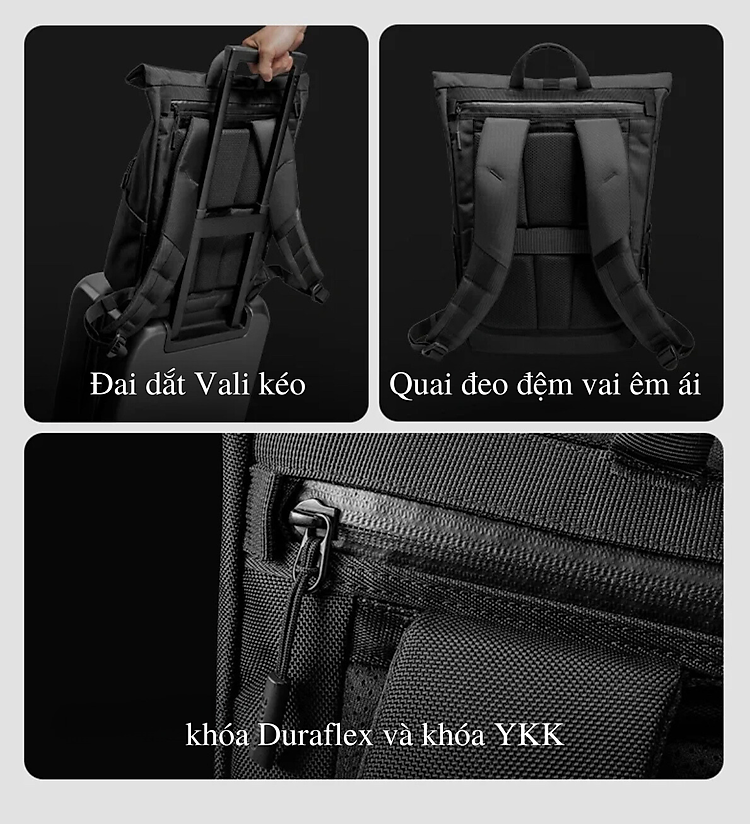 Thiết kế Rolltop mượt mà: Với thiết kế rolltop đặc biệt, balo giữ được vẻ mượt mà và thoáng khí. Với khóa Duraflex và khóa YKK, phần đầu được cuốn gọn và bảo vệ bên trong khỏi ẩm ướt và tạo thêm không gian. Ngăn chính được may kín toàn bộ để bảo vệ đồ vật của bạn khỏi các yếu tố của thiên nhiên, trong khi bề mặt lưng được đệm và thông thoáng để đảm bảo sự thoải mái và thông khí cho hành trình trọn vẹn hơn.