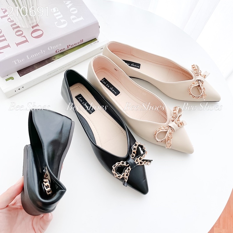 Giày Dép Nữ > Giày đế bằng > Giày sục & Giày búp bê || BEESHOES - GIAY BÚP BÊ KHUY NƠ XÍCH DA MỀM SẴN MÀU ĐEN, KEM 210691