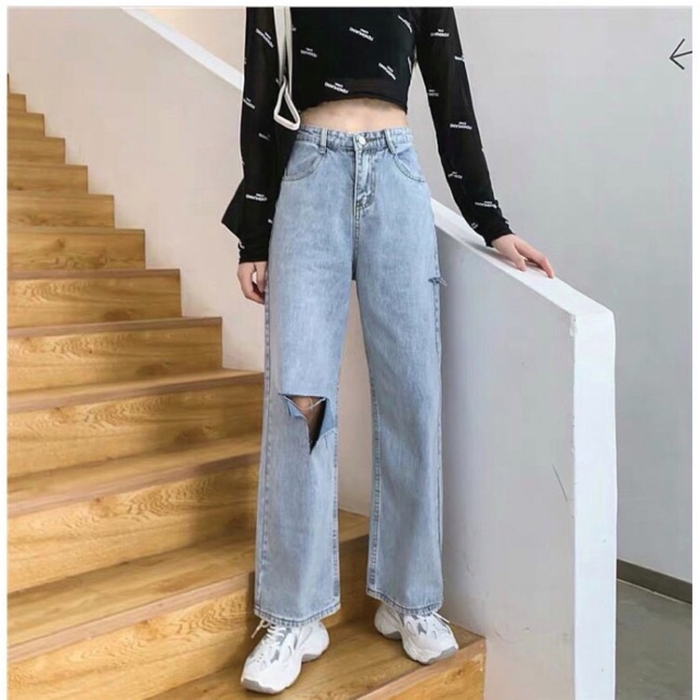 Giới thiệu [Big Size] Quần Ống Rộng Rách 1 Hông Đùi Và Gối T - Form To Chuẩn Dài 105cm/ Quần Jeans Size Đại - Lưng Cao