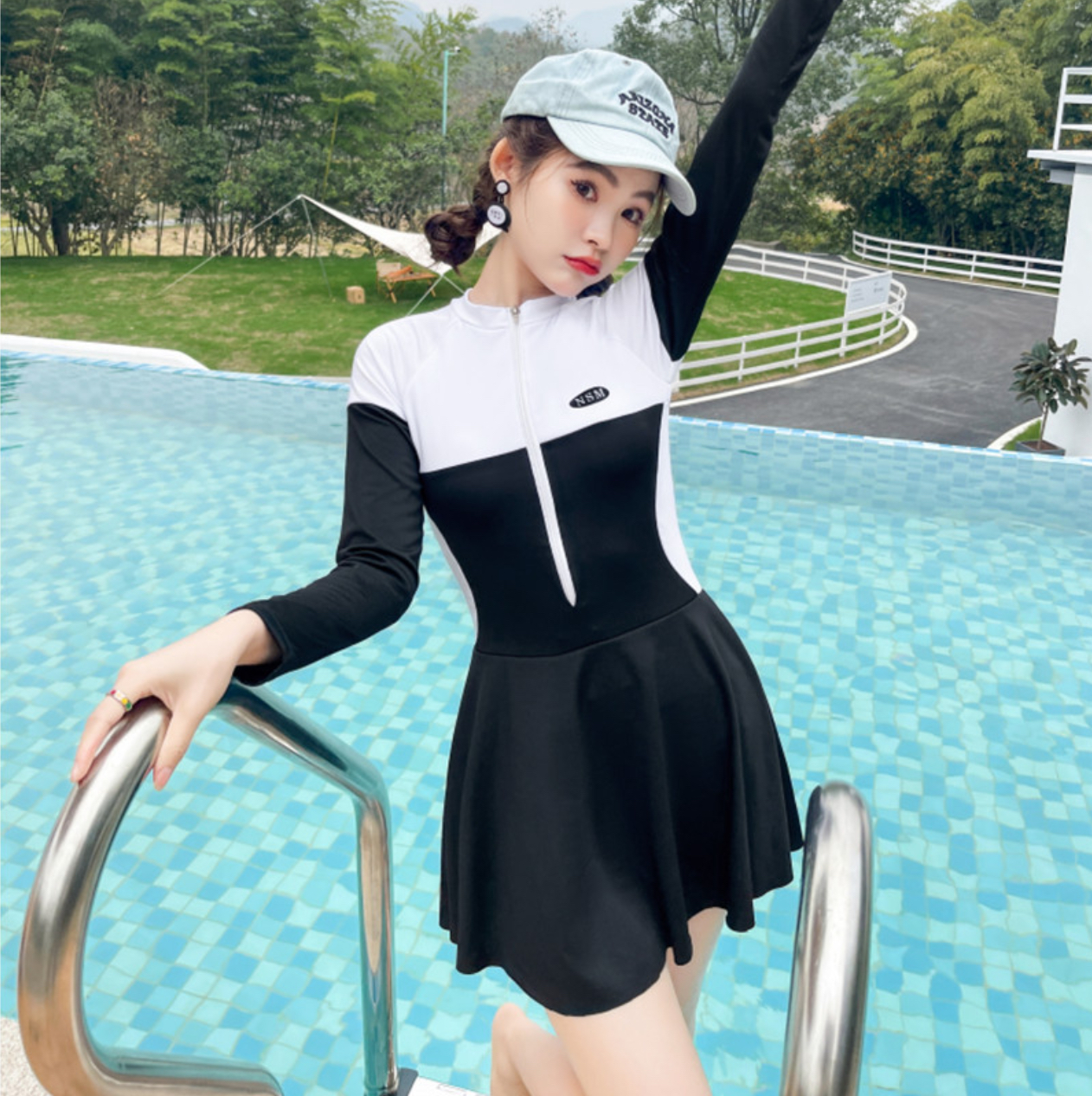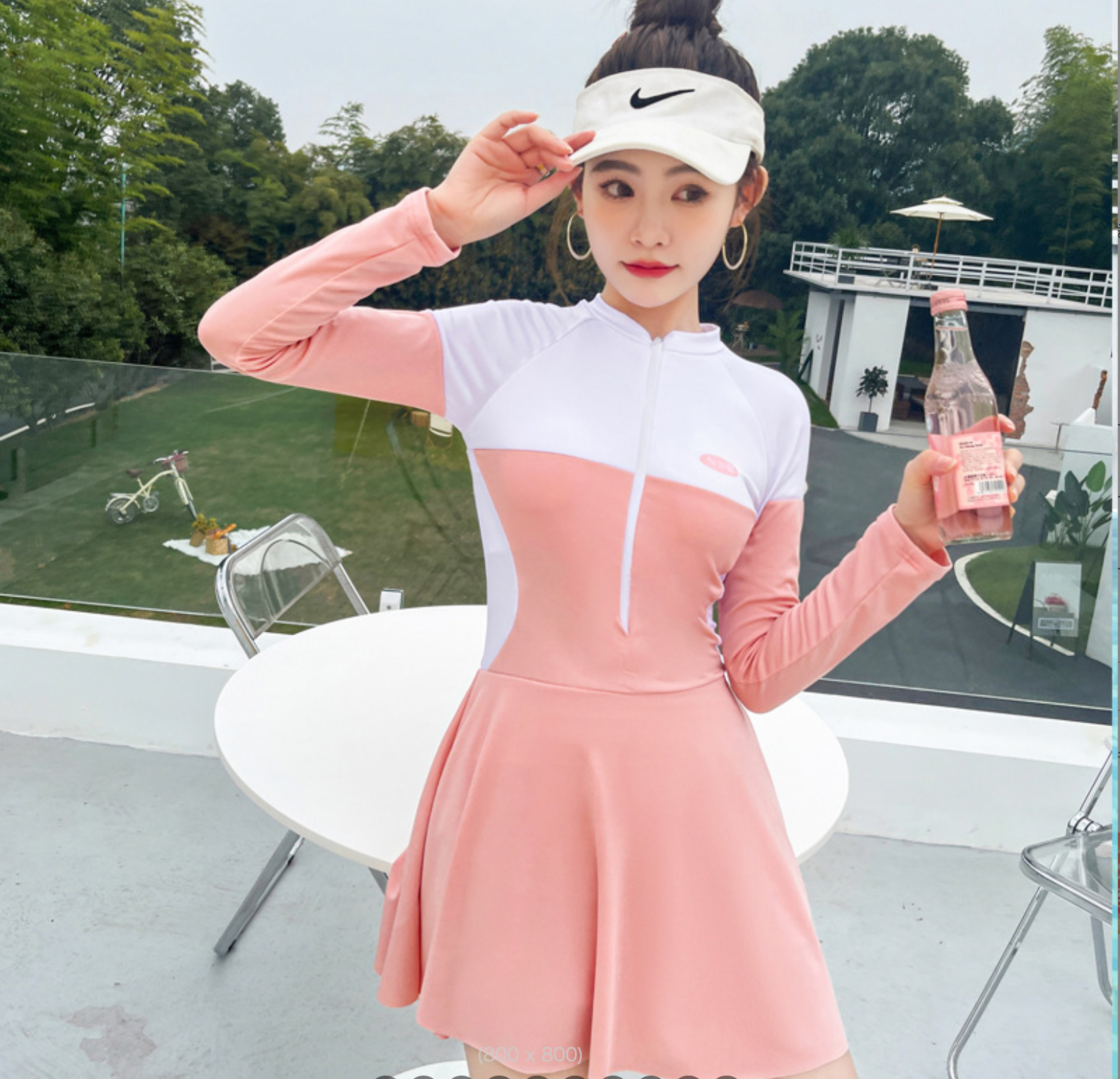 - Set gồm: váy liền (có quần đùi bên trong), áo tay dài che nắng