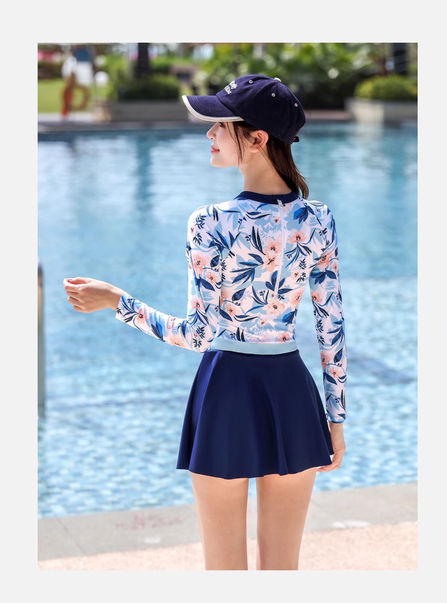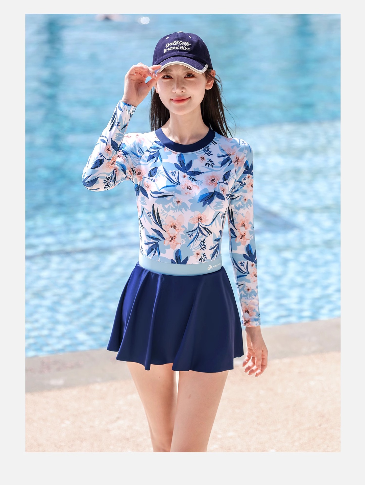 - Bộ liền thân kín đáo: Gồm áo dài tay và quần bơi tam giác liền thân, mang lại sự che chắn tối đa mà vẫn giữ được nét thanh thoát. Áo có khóa kéo phía sau giúp bạn dễ dàng hơn khi sử dụng.