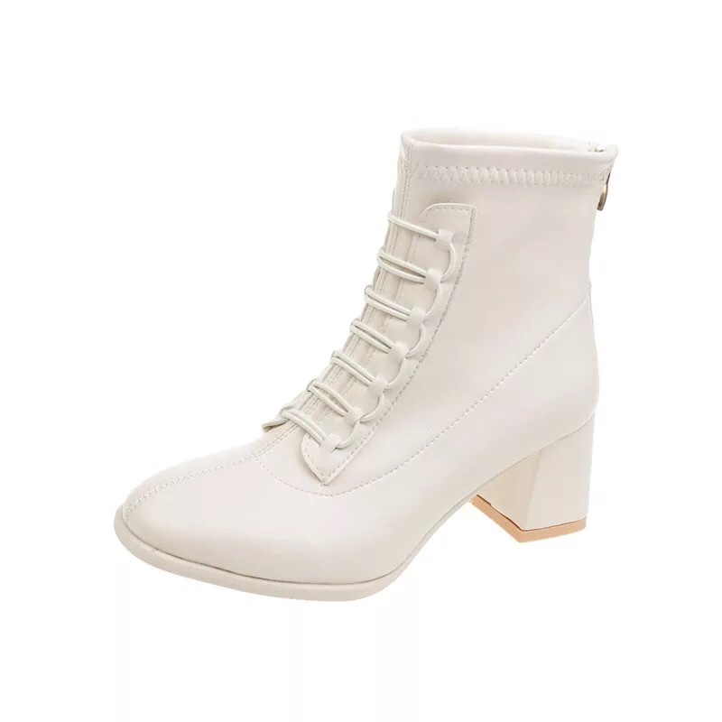 Giày Boot Nữ Cổ Cao, Gót Vuông Thời Trang Dây Buộc Trước Có Khóa Kéo Sau Tiện Lợi.
