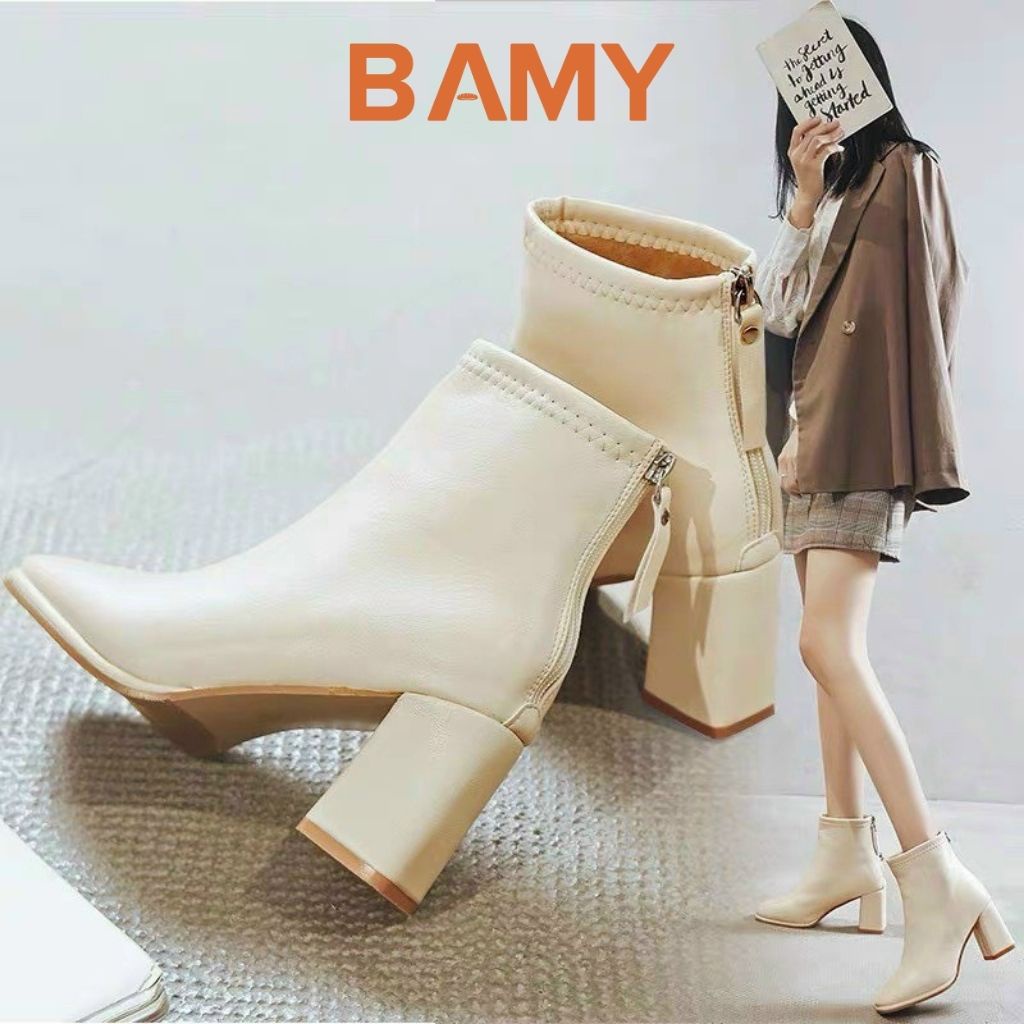 Bốt nữ da mềm Cao Cấp cổ cao khóa sau BAMY , giày boots ulzzang mũi vuông gót vuông 5 phân