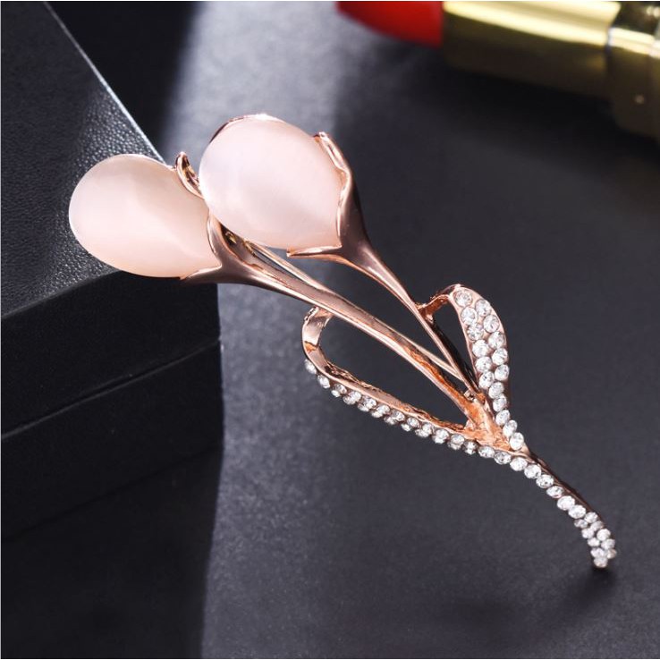 Ghim cài áo hình Hoa Tulip xinh đẹp đính viên ngọc sáng bóng.
