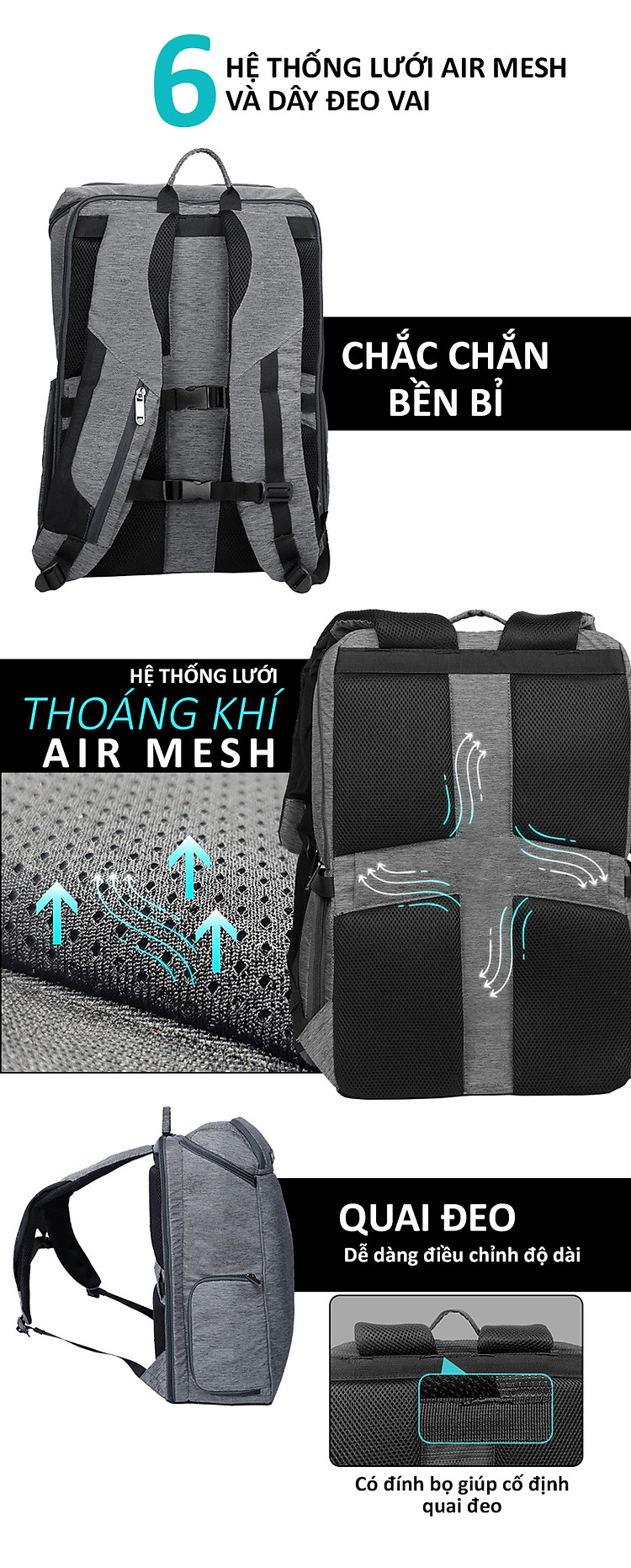 - Thân sau: phần lưng được may chắc chắn, tỉ mỉ từng đường nét, hệ thống lưới Air Mesh thoáng khí cho cảm giác thoải mái khi đeo.