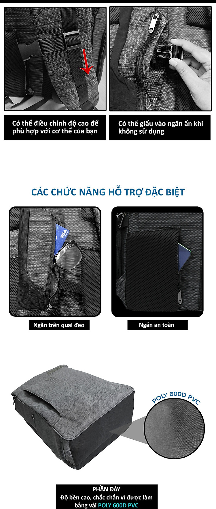 - Quai đeo: thiết kế ôm rất sát hai vai, chắc chắn, việc nới dài – thu ngắn dây đeo vô cùng linh hoạt, quai xách tích hợp trên quai đeo tiện lợi.
