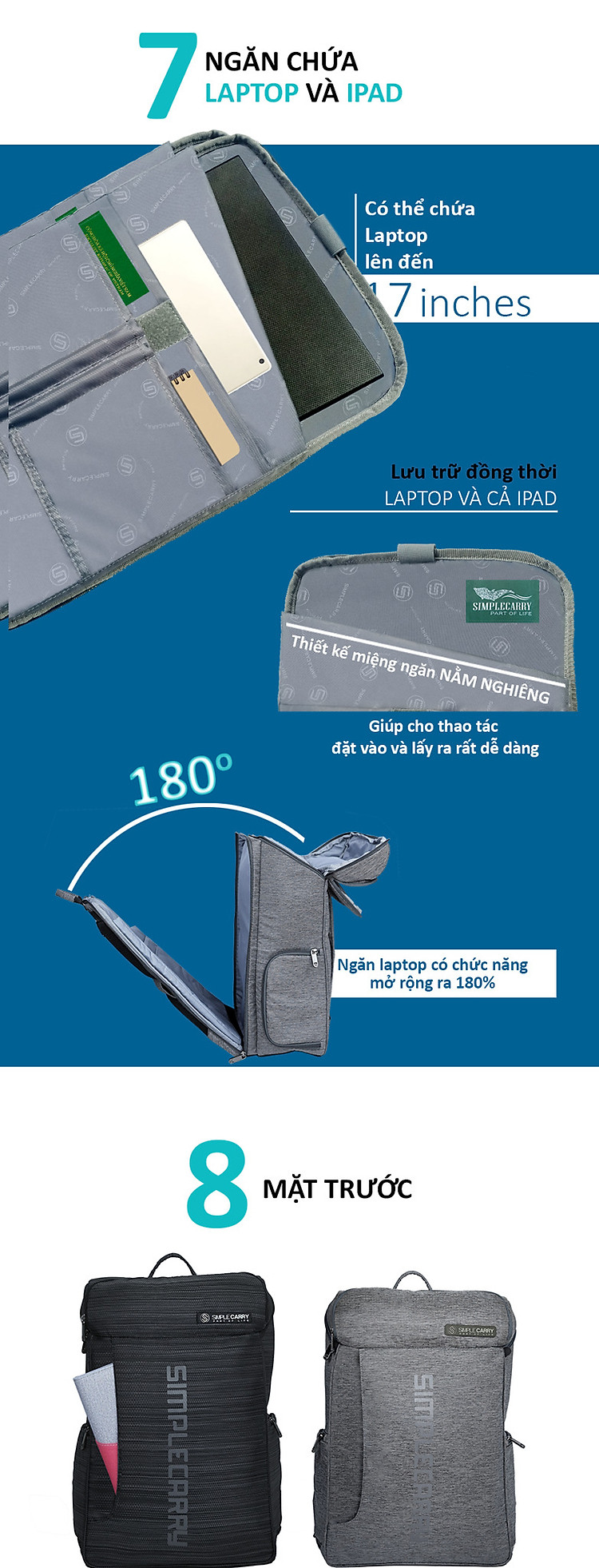 - Balo Simplecarry MK5 gồm ngăn chính lớn, có thể chia thành 2 phần khác nhau. Ngăn đựng laptop 17 inch riêng biệt có thể mở rộng 180 độ, miệng ngăn nằm nghiêng giúp cho thao tác đặt vào lấy ra rất dễ dàng.