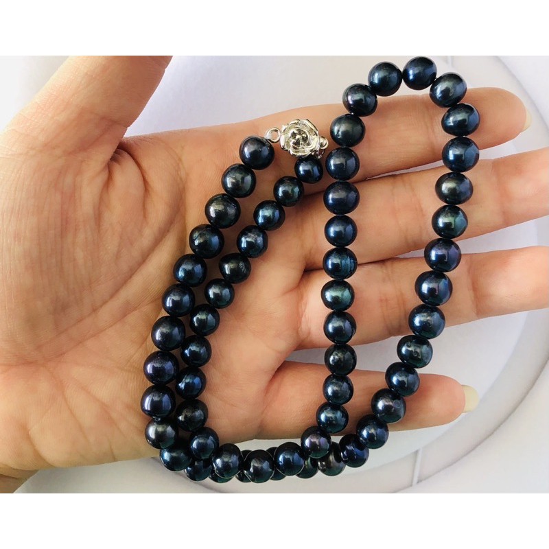 Chuỗi đeo cổ hạt trai thật màu đen ánh xanh 7ly