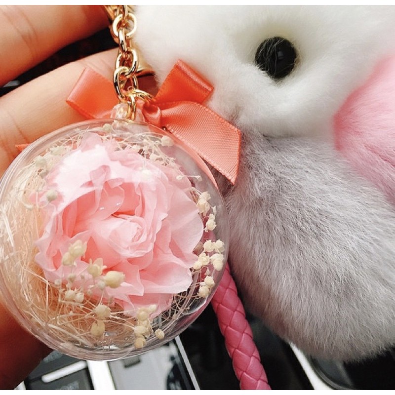 Chân thỏ thêu chỉ vang kim tuyến lấp lánh sang chảnh, kèm hoa hồng khô ép chân không trong khối tròn trong suốt siêu lung linh.