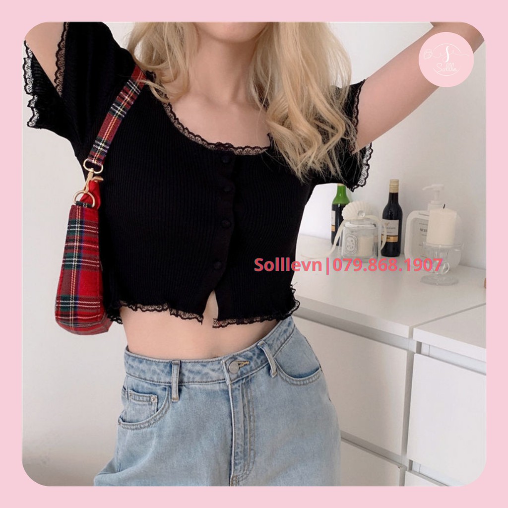 Croptop cổ vuông viền ren Sollle áo kiểu ngắn tay form ôm Hàn Quốc