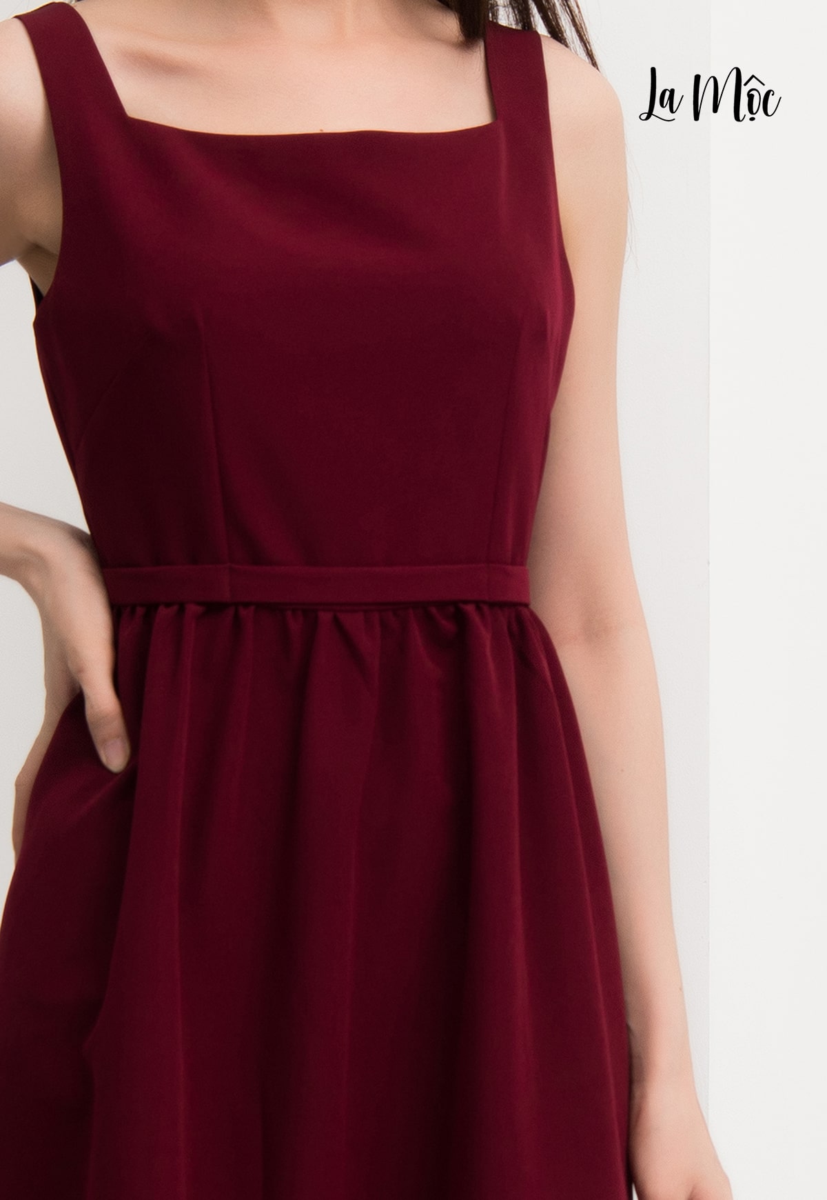 Đầm đỏ cổ vuông, thắt eo - LA MỘC chất liệu vải LỤA XOA KOREA