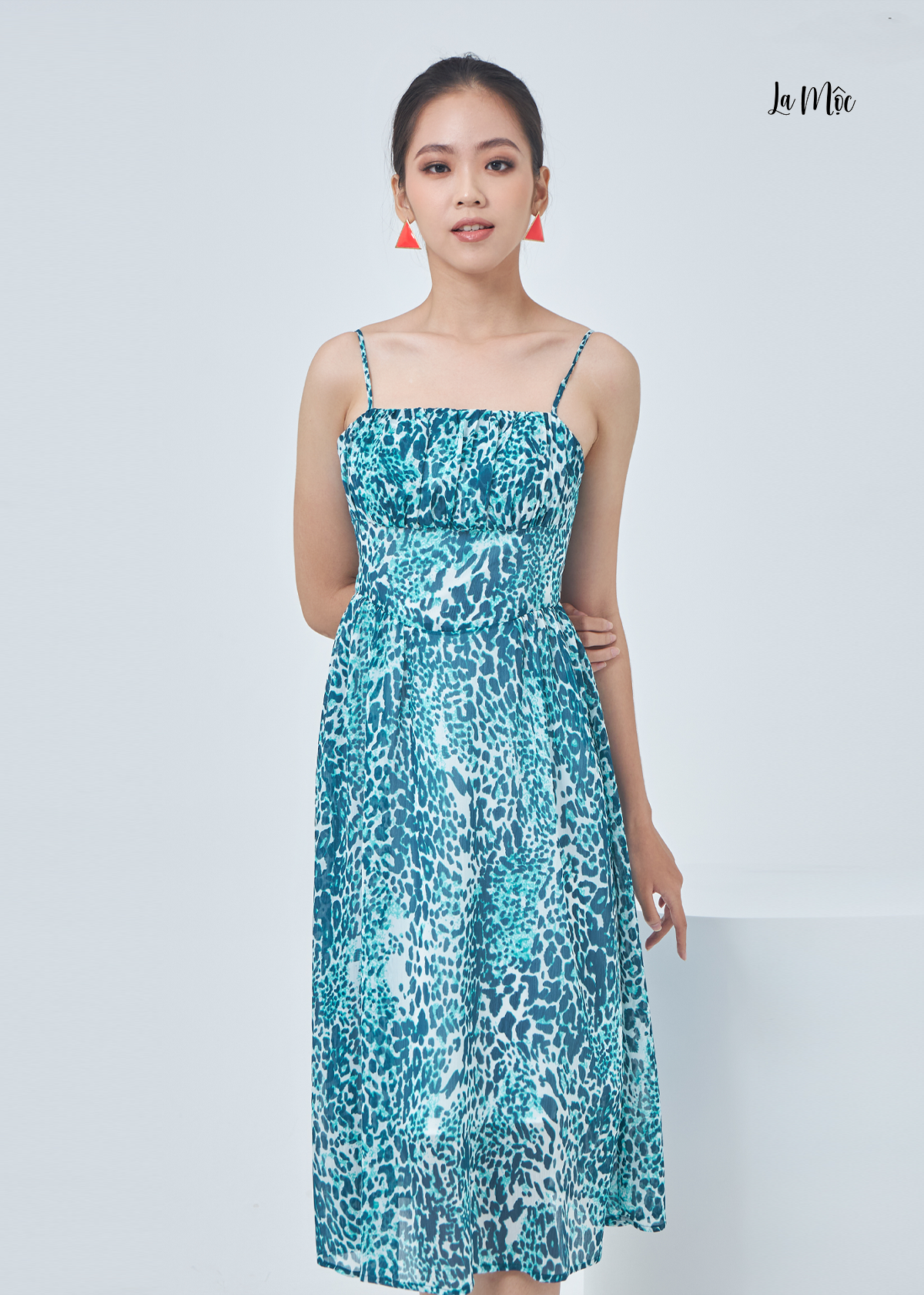 Đầm chất liệu chiffon Hàn Quốc, dáng xoè 2 dây cúp ngực, hoạ tiết da beo màu xanh, ôm eo.
