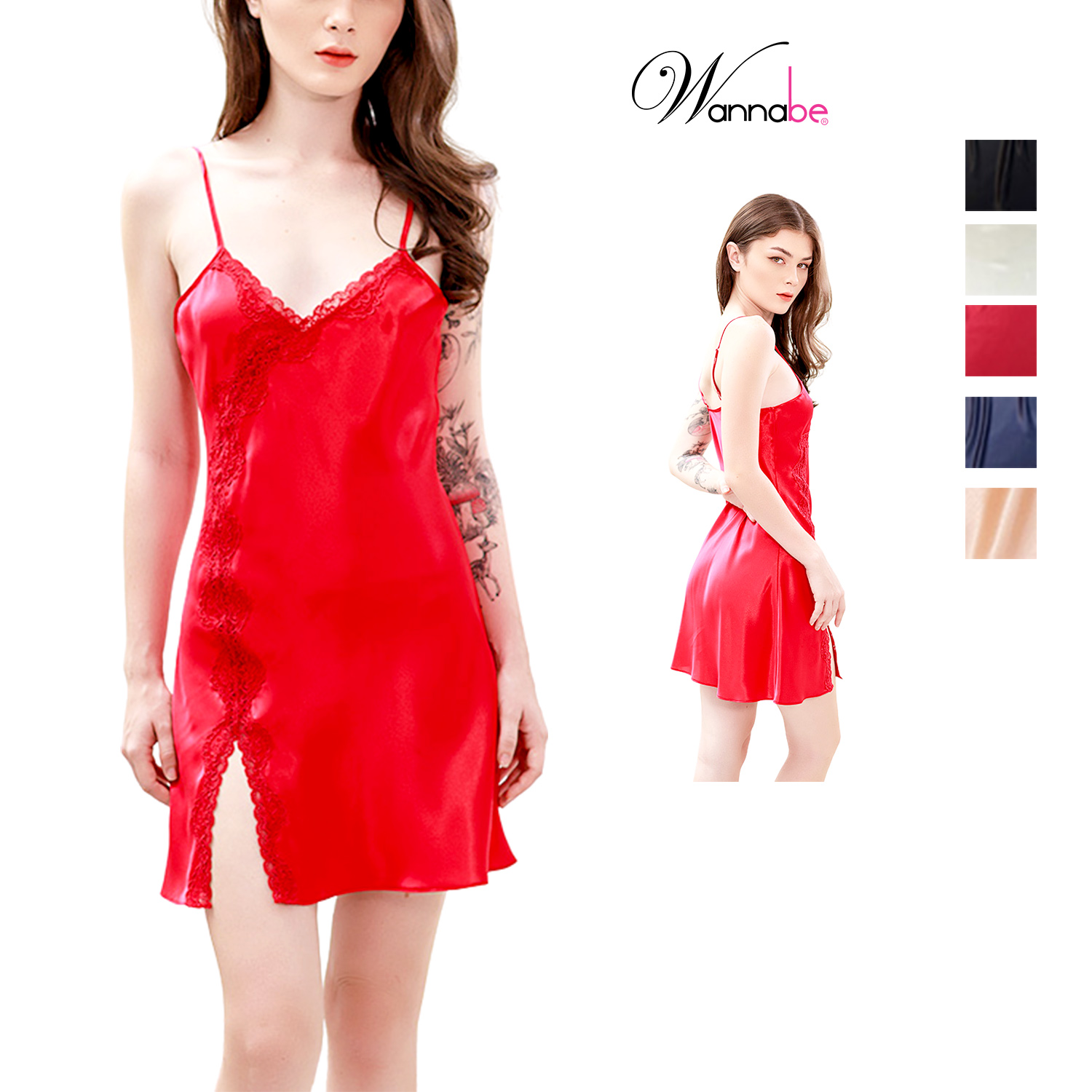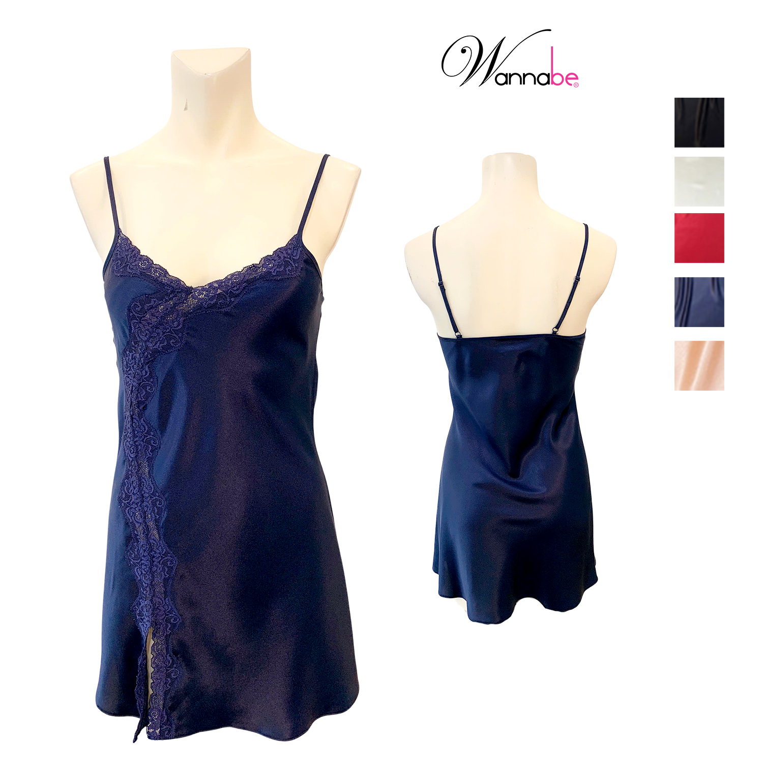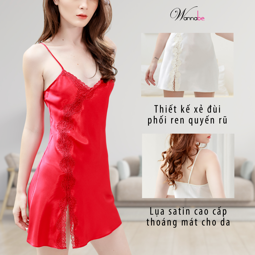 Đầm ngủ phi lụa cao cấp Wannabe DNS59 kiểu dáng đầm xuông chữ A đơn giản tôn lên vẻ đẹp nữ tính trang nhã. Thiết kế đơn giản nhưng không hề đơn điệu với kiểu áo hai dây, viền đăng ren gợn sóng xẻ 1 bên đùi khoe khóe đôi chân thon gọn quyến rũ gợi cảm của phái nữ khi diện chiếc đầm ngủ này