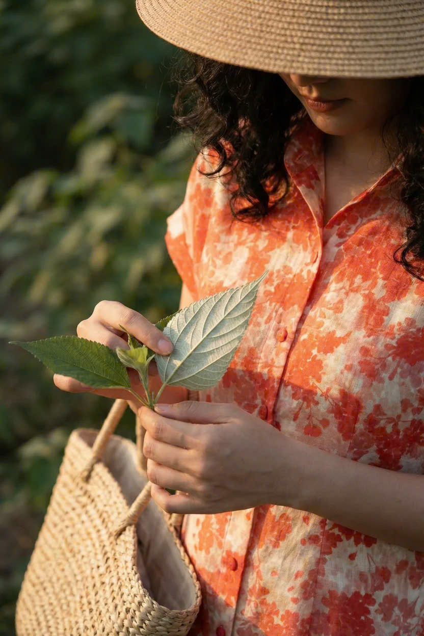 Họa tiết hoa được ta tạo nên là ký ức của thiên nhiên được giữ lại trên bề mặt vải – một dạng sống khác, đã đi qua nắng, qua gió, rồi nằm lại trên thân thể ta.