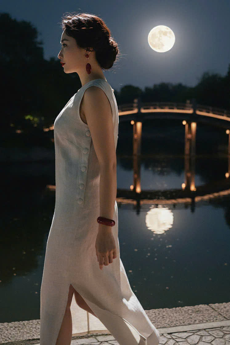 Như ánh trăng rơi trên mặt hồ phẳng lặng, chiếc đầm suông Lanh gợi cảm giác an nhiên và thanh tao nơi người mặc.