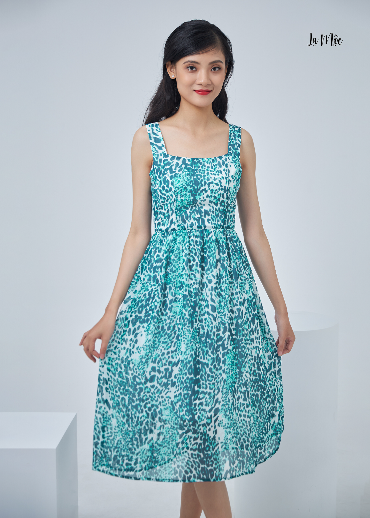 Đầm La Mộc cổ vuông trước, vuông sau, họa tiết da beo màu xanh, dáng xòe, ôm eo.