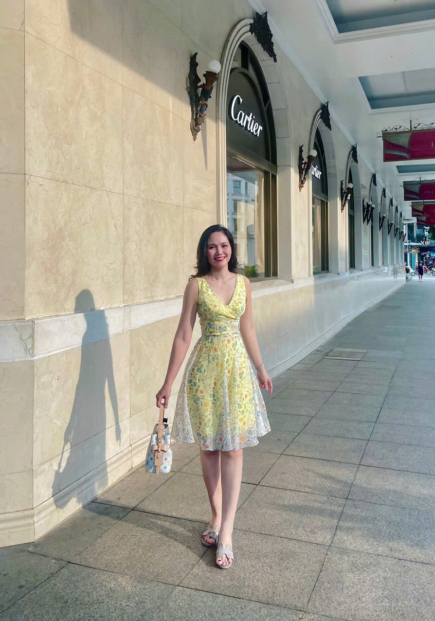 Trên nền vải organza in hoạ tiết Soleil được Hity thiết kế độc quyền, sắc vàng citron tươi sáng hòa quyện cùng họa tiết hoa lá tựa như một khu vườn nở rộ đang khẽ lay mình trong gió. Mỗi chi tiết của thiết kế đều là một sự tính toán tinh tế: Cổ V khoét sâu vừa phải tôn lên chiếc cổ cao thanh tú, phần eo được chiết ly khéo léo để tạo nên vòng eo con kiến đáng mơ ước, và chân váy dáng A xoè nhẹ nhàng, bay bổng trong từng bước chuyển động. Đầm được kỹ lưỡng lót chất lụa mềm bay bổng khoan thai.