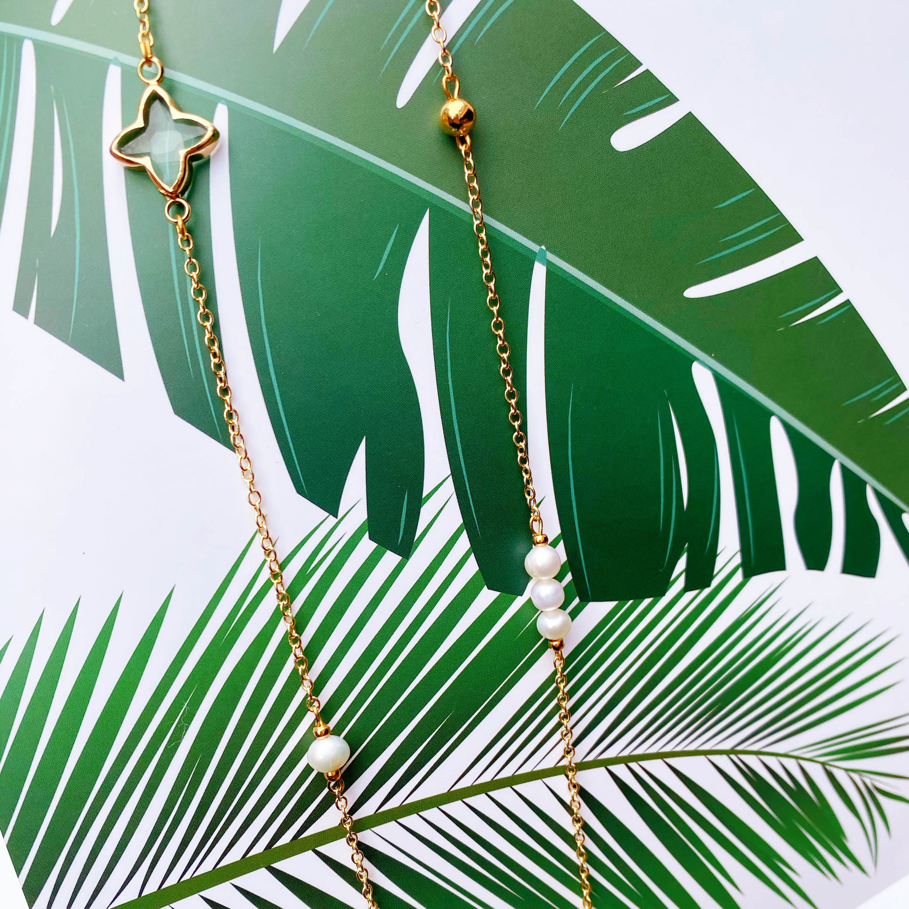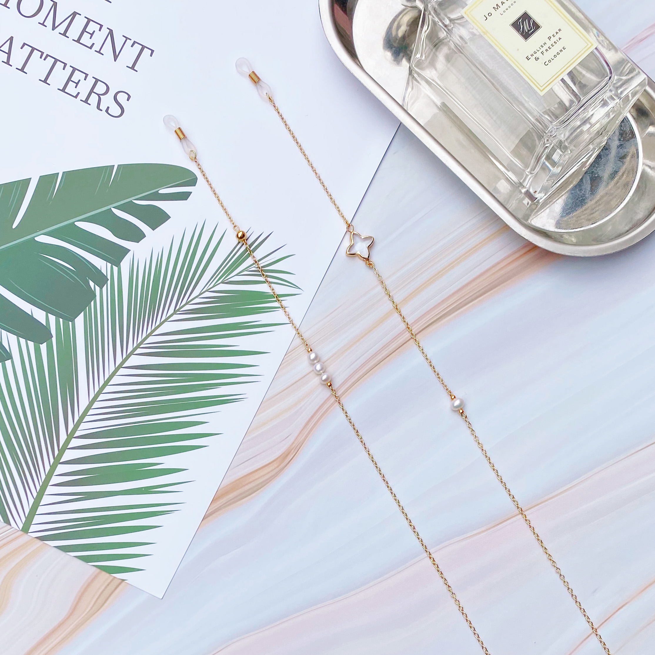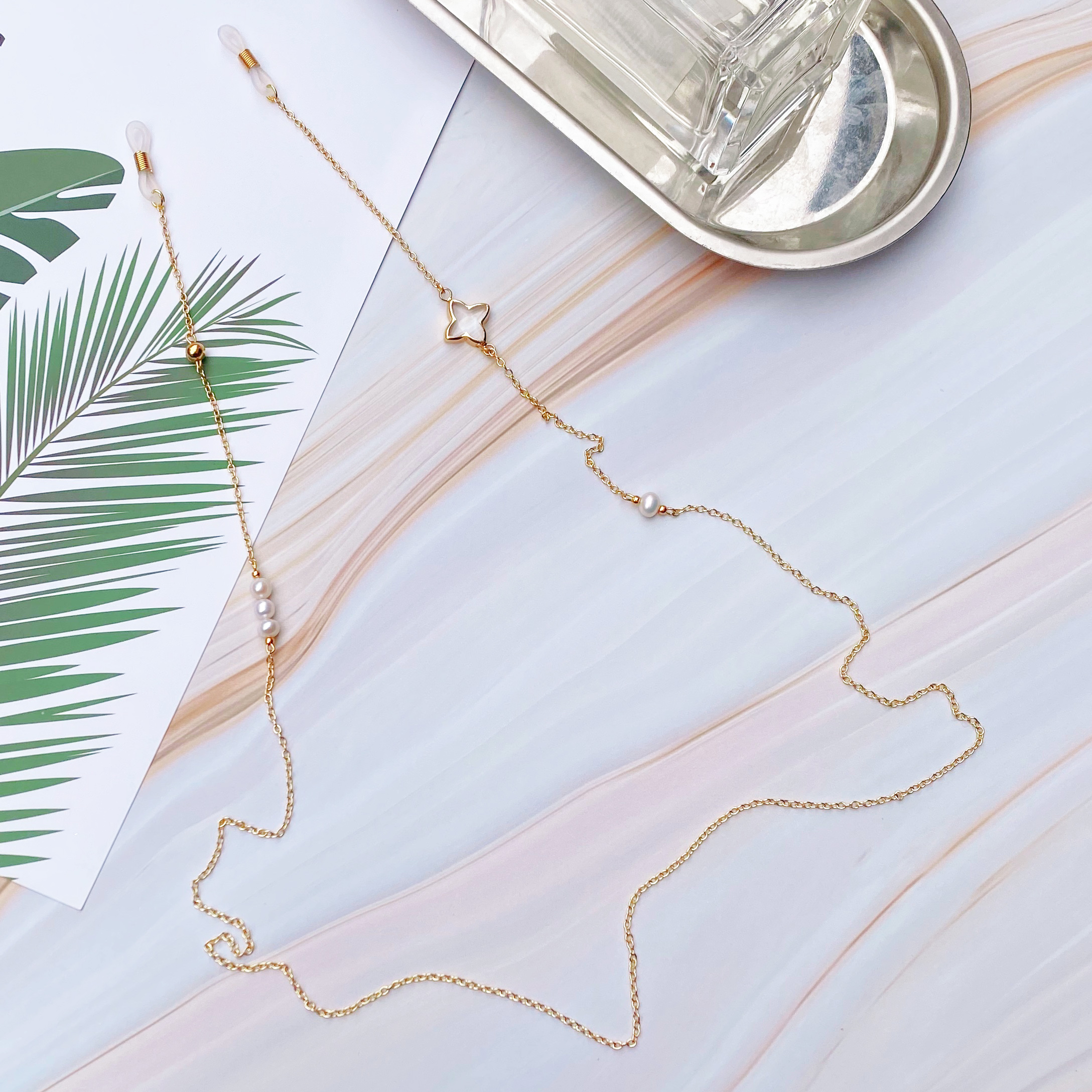 Dây kính chuỗi đeo gọng kính mix cỏ bốn lá và hạt châu không đối xứng ấn tượng dây chuyền giữ khẩu trang và tai nghe