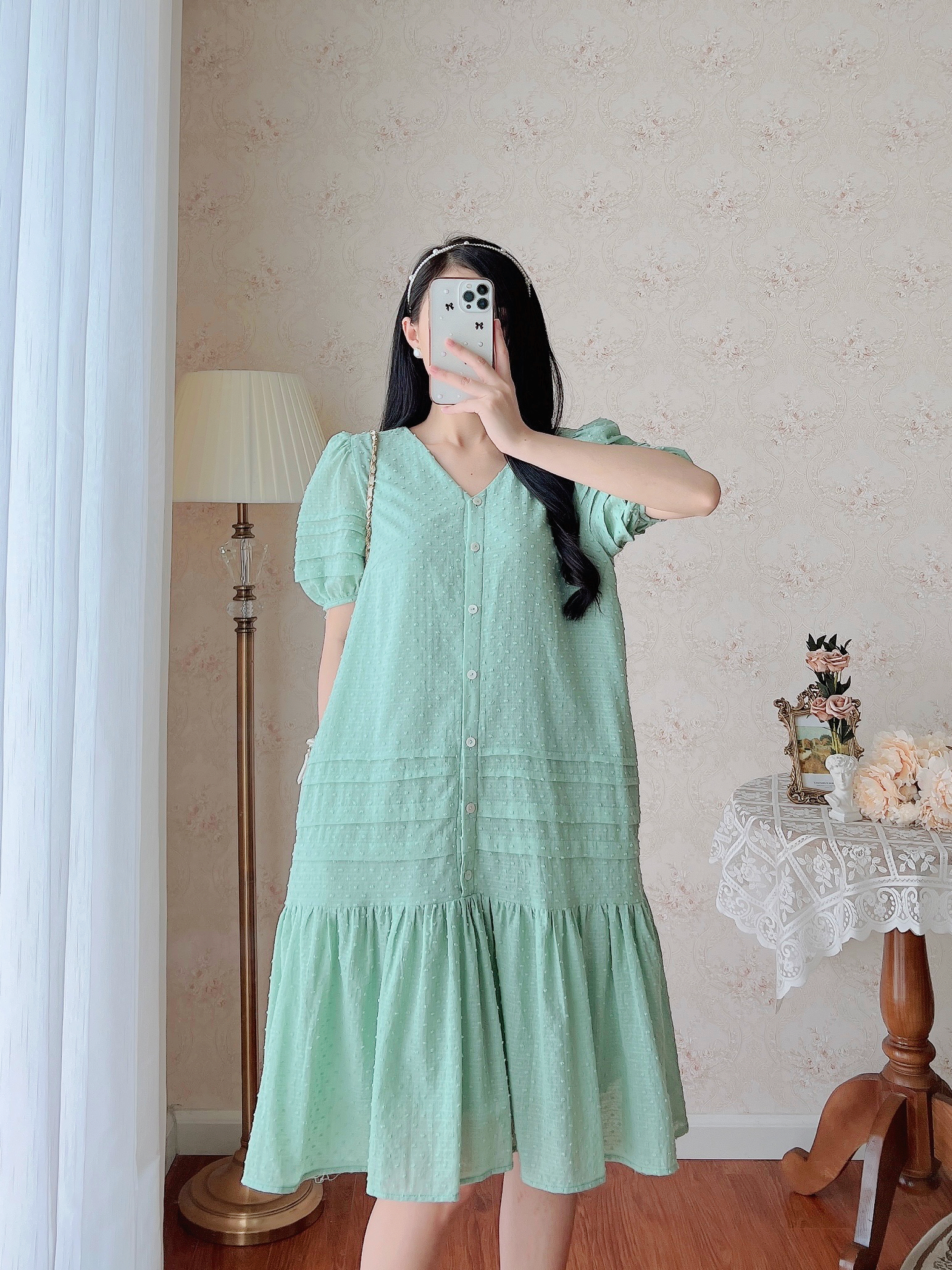 Đầm 2 lớp, có túi sườn, cài cúc trước kết hợp chui.