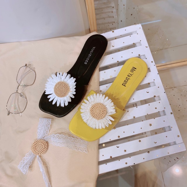 Giới thiệu Dép đế bằng quai ngang đính hoa cúc mũi vuông
