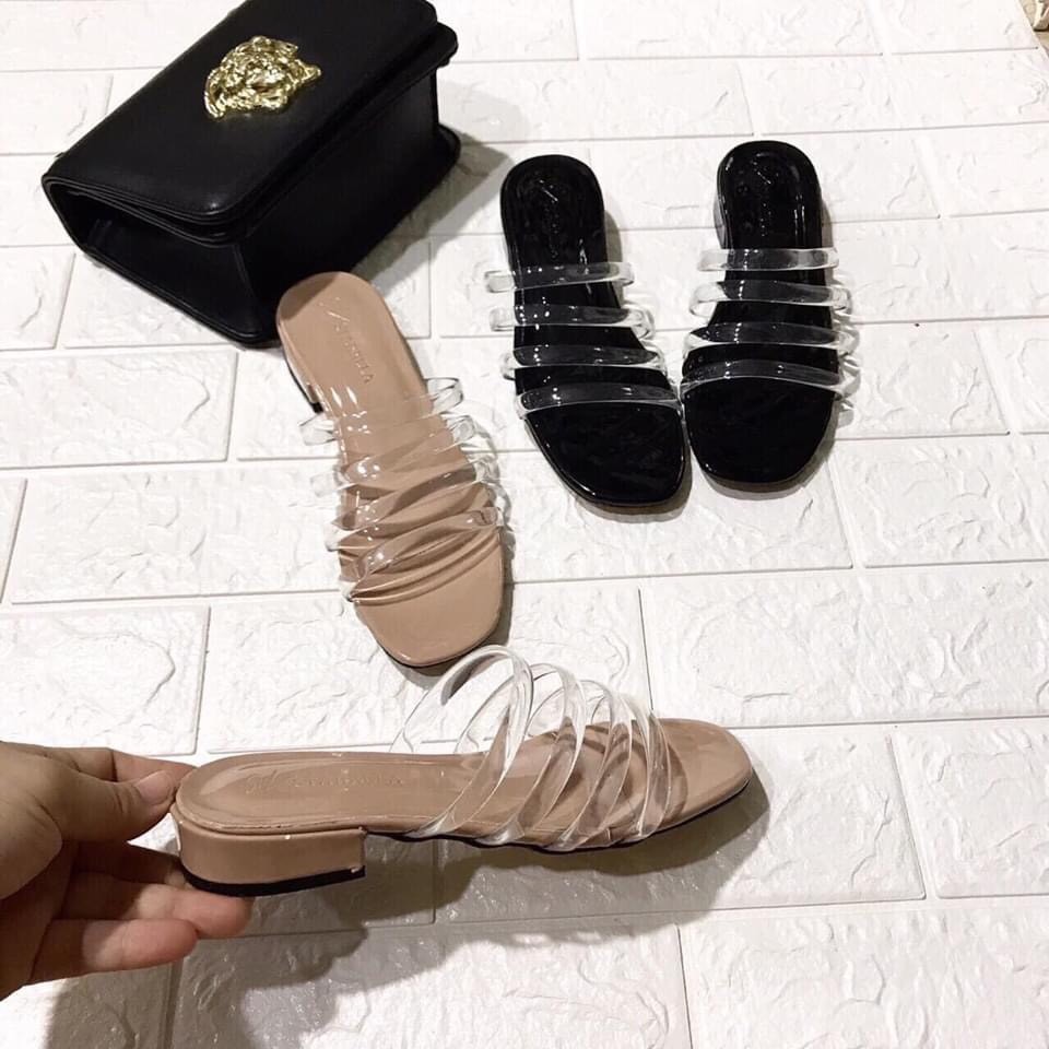 Giày Dép Nữ > Xăng-đan và dép > Xăng-đan đế bằng || Dép lê quai mica dây mảnh ngang kem bạc