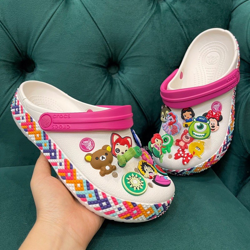 Giày Dép Nữ > Giày đế bằng > Giày sục & Giày búp bê || Dép sục viền thổ cẩm màu trắng quai hồng đậm( tặng 12sticker)