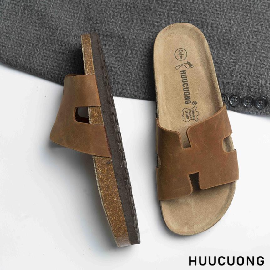 Giới thiệu Dép unisex Chữ H HUUCUONG Quai Da Thật Màu Nâu Đế Trấu