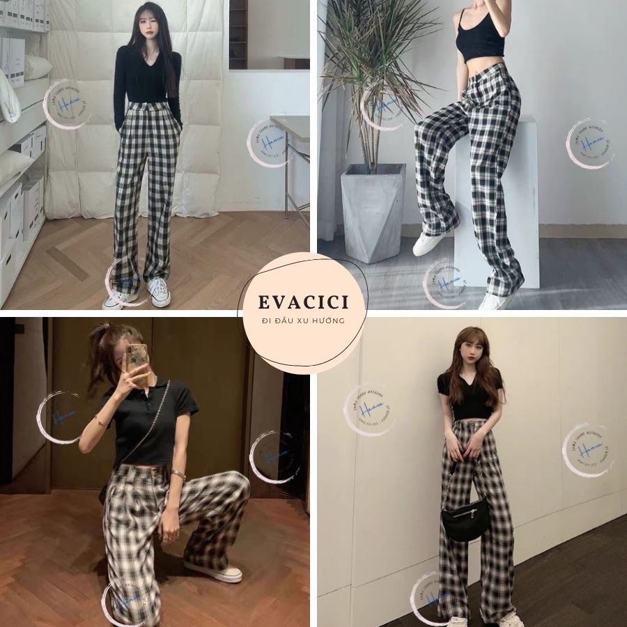 Giới thiệu [EVACICI] Quần kẻ karo ống rộng dáng suông nhiều màu mẫu mới. Quần cullotes khuy trước chun sau hack dáng.