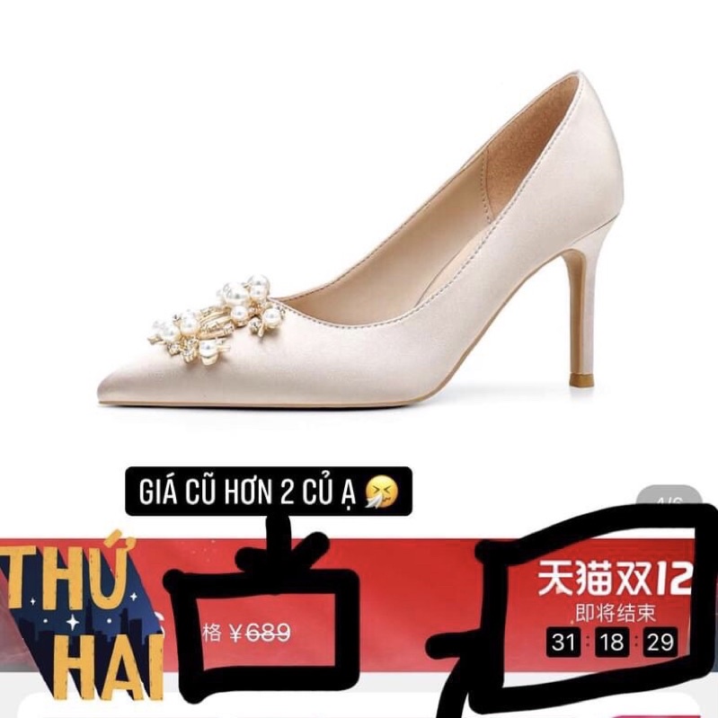 GIÀY CAO GÓT MŨI ĐÍNH NGỌC CAO 8 PHÂN MÀU BE BỌC LỤA CAO CẤP