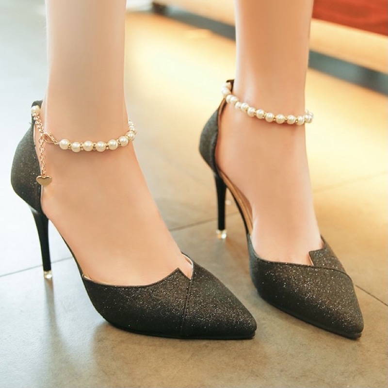 tên sản phẩm: giày cao gót nhọn 8p bít mũi kim tuyến vòng cổ hạt châu