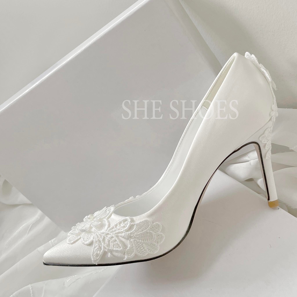 2. CHẤT LIỆU LỤA SATIN CAO CẤP : hoạ tiết REN BÔNG nổi bật, với màu sắc trắng tinh khôi, chất liệu cao lụa satin cao cấp rất phù hợp với những chiếc đầm cưới tạo nên một couple hoàn hào. Chắc chắn nàng sẽ trông rất xinh và sang khi ướm lên đôi giày cao gót, giày xinh này