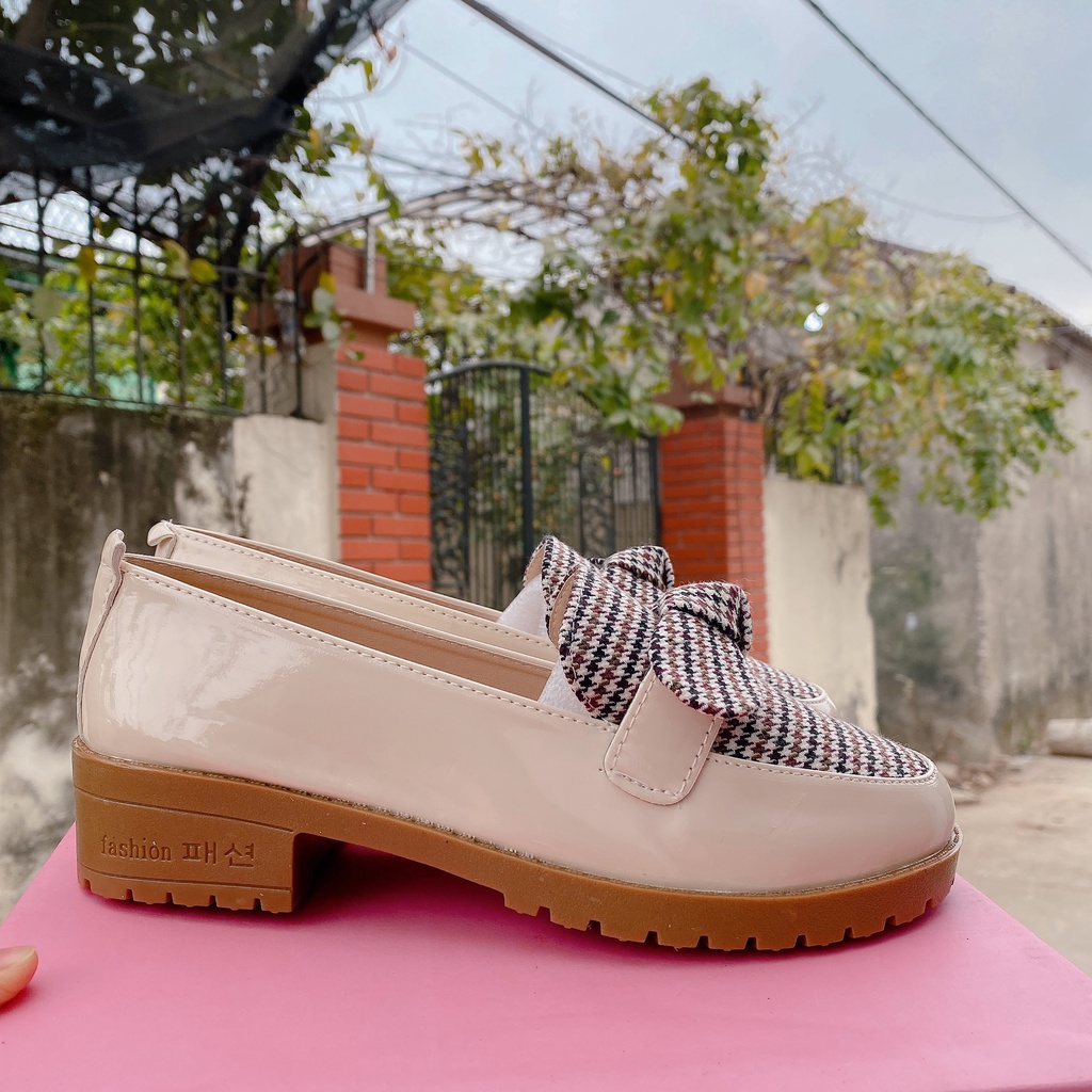 ✔️ Giày Đốc nữ BAMY da bóng mềm phối vải kẻ tinh tế, kết hợp nơ nhẹ nhàng nữ tính