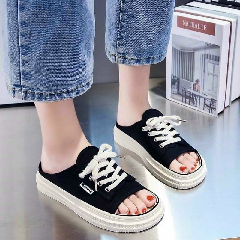 Giới thiệu Giày sục thể thao nữ hở mũi chất liệu canvas kiểu dáng thời trang đế cao 4 cm phong cách hàn quốc năm nay