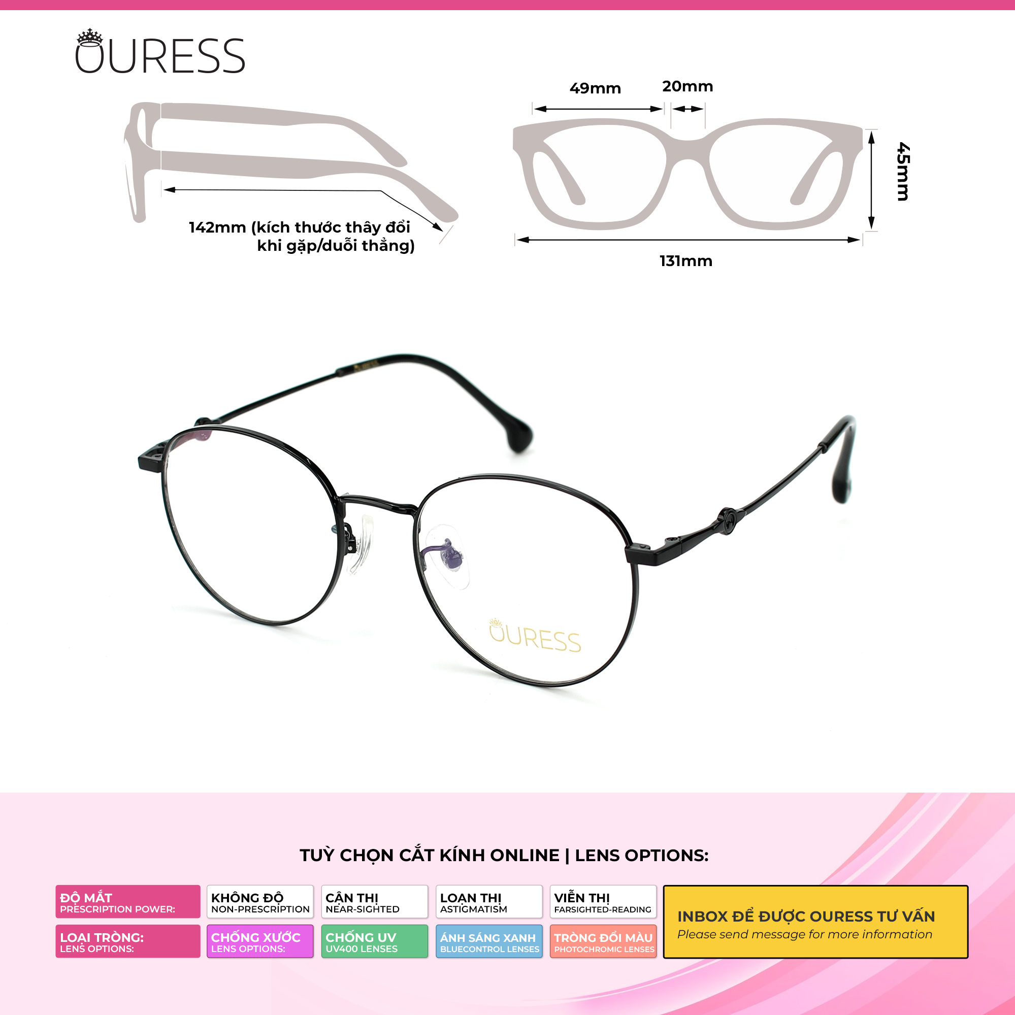 + Cung cấp PD (khoảng cách đồng tử) hoặc hình chụp cận cảnh gương mặt qua Tin nhắn cho Ouress