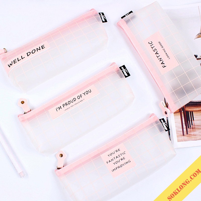 Giới thiệu Hộp bút trong suốt mờ ghi thông điệp, Bóp viết caro đựng đồ dễ thương