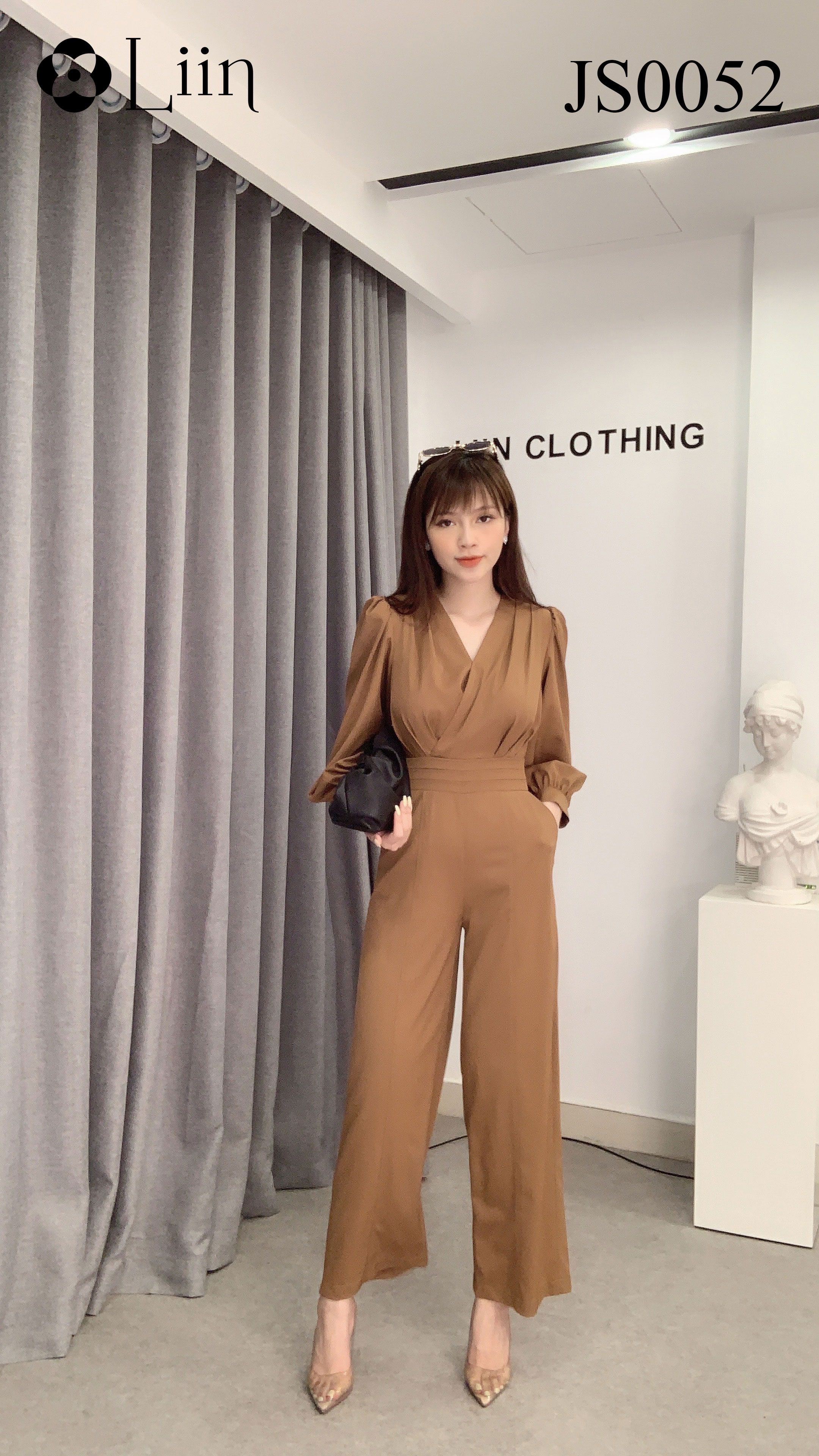 Giới thiệu Jumsuit nữ màu Nâu dáng Dài thiết kế cổ V, ôm eo tôn dáng Liin Clothing JS0052
