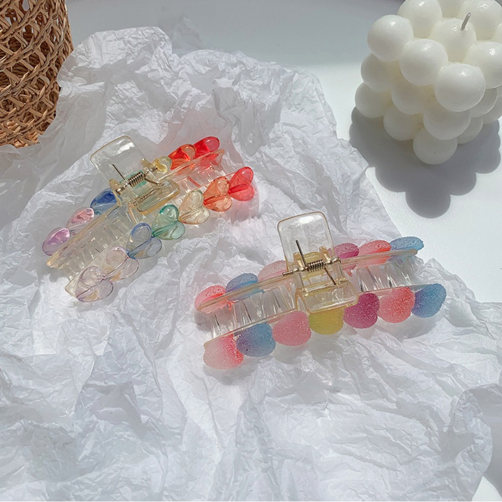 Kẹp tóc càng cua và kẹp mái đính charm kẹo dẻo hình trái tim, phong cách dễ thương, ngọt ngào.