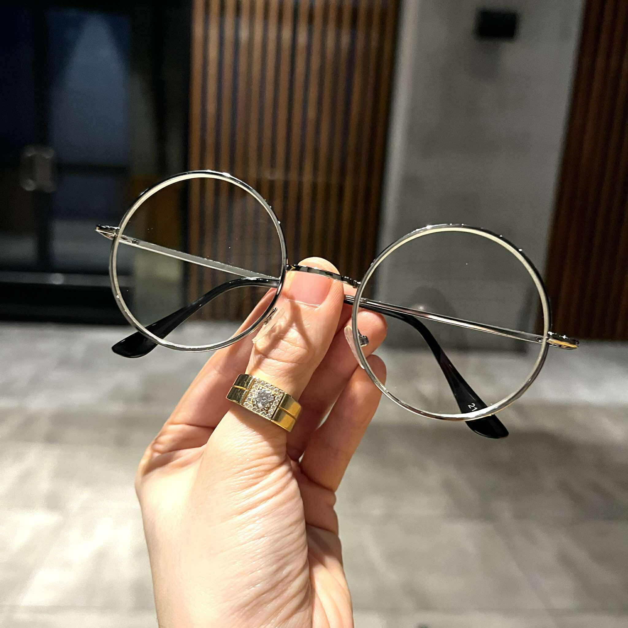 Kính thời trang nam nữ dáng Mắt tròn bản lề nhíp lò xo gọng kim loại bạc