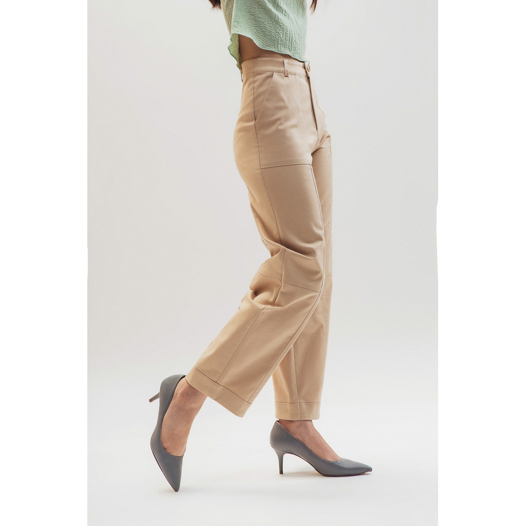 Quần dài ống suông có túi đắp phía trước, làm bằng vải khaki mềm màu nâu nhạt.