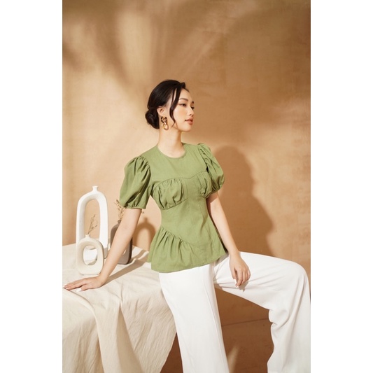 - Áo cổ tròn, thiết kế tay bồng bo chun, vai nhún giúp vai không bị thô