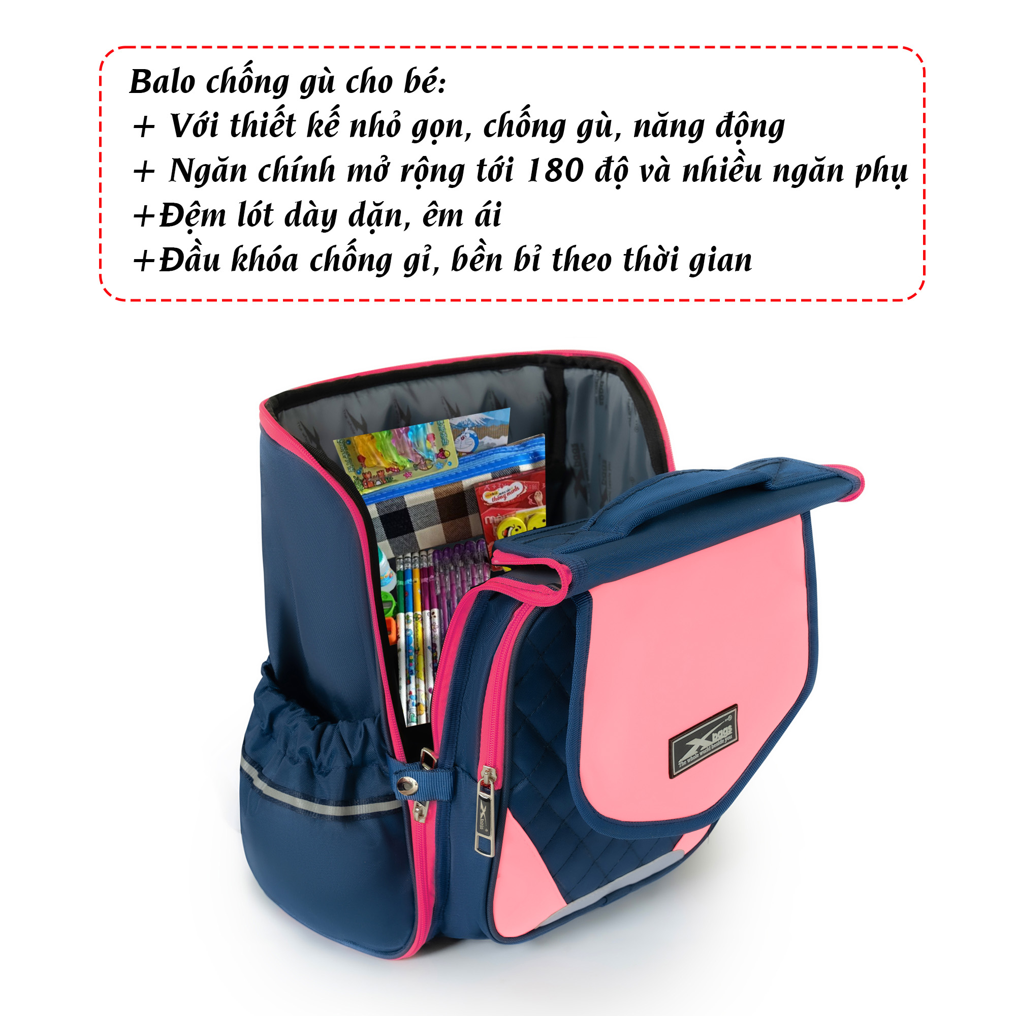 Các bé gái sẽ thích thú ngay từ cái nhìn đầu tiên với tông màu hồng phối xanh đậm tạo nên chiếc ba lô thể hiện sự ngọt ngào, trong sáng, tăng thêm vẻ đẹp hồn nhiên trong từng bước chân bé đến trường