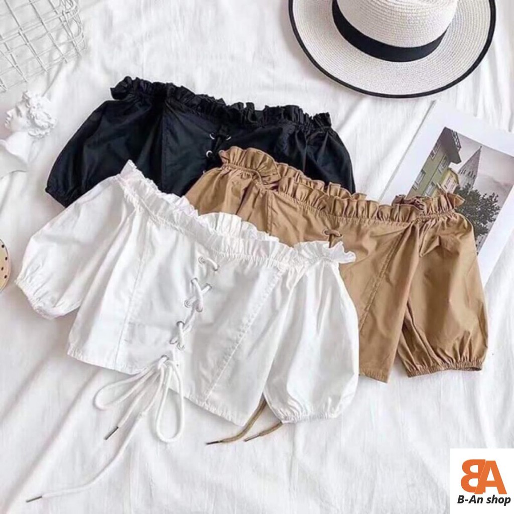 Áo from croptop bẹt vai đan dây ngực. tay áo ngắn phối bồng