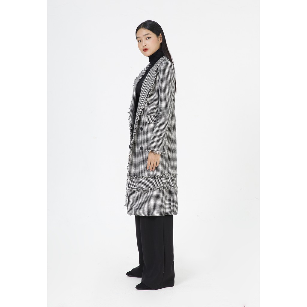Áo Khoác Dáng Dài Kẹp Tua Rua trên chất liệu vải tweed hoạ tiết houndstooth thời trang. Áo dáng dài trẻ trung và phong cách, được nhấn nhá bằng các chi tiết tua rua khắp thân áo. Áo dễ dàng phối với nhiều loại trang phục theo các phong cách khác nhau