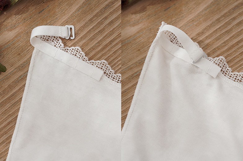 Chất liệu REN XỊN lạnh, nhẹ và mát sẽ giúp bạn thật thoải mái và dễ chịu khi diện các trang phục mùa hè. Có ren và có hai kẹp nhựa nhỏ trong suốt ở hai bên.