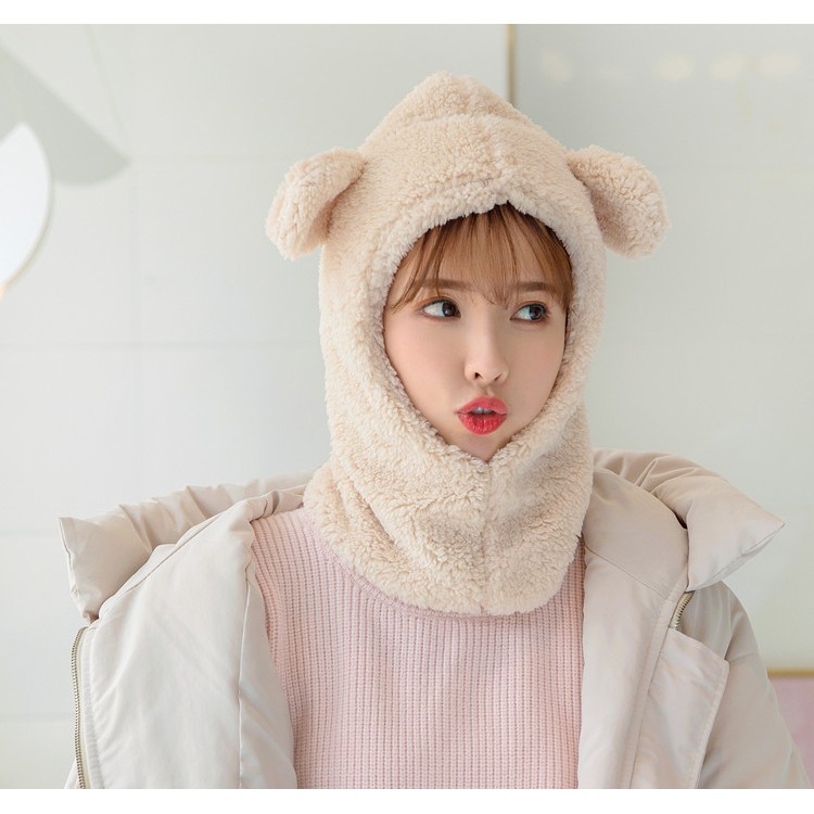 Giới thiệu Mũ len lông cừu liền khăn cổ tai gấu dễ thương ấm áp mùa đông thích hợp cho bạn gái