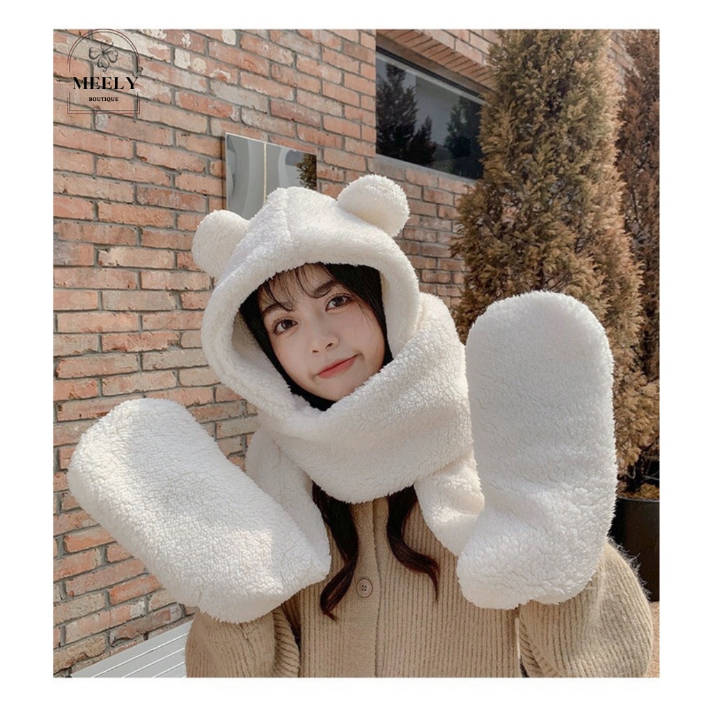 MŨ LÔNG CỪU TAI GẤU KÈM KHĂN QUÀNG CỔ VÀ GĂNG TAY 3IN1