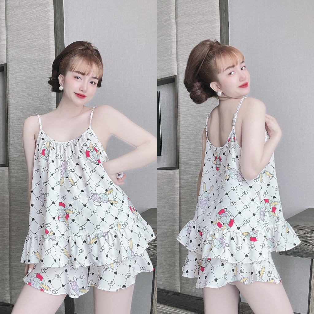 - Mô tả: Áo 2 dây viền bèo kèm họa tiết hoạt hình dễ thương. Quần may viền bèo dễ thương, áo có dây tăng đơ phom rộng rãi mềm mát.